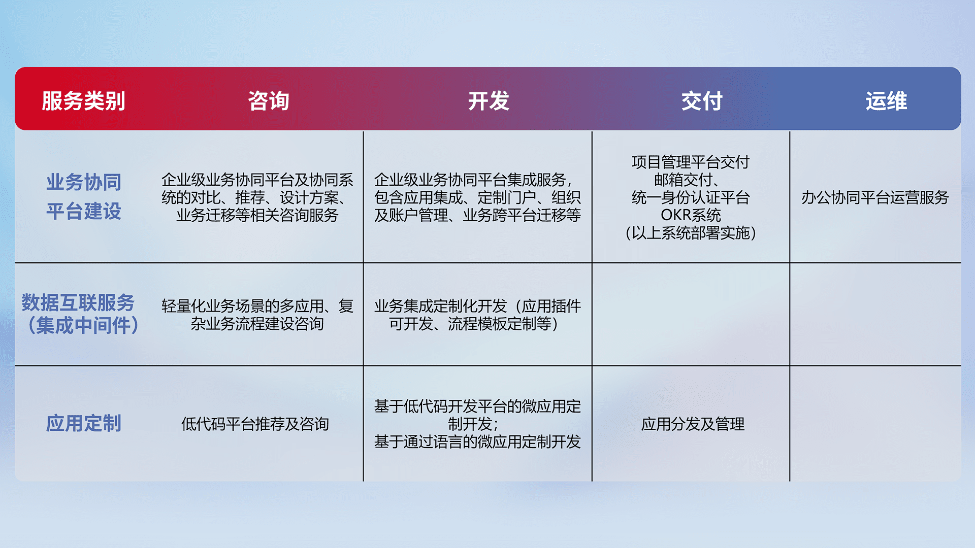 针对钉钉、、、企微、、IDaas等平台级产品提供产品的规划、、、、方案、、交付、、、、定制化开发等服务,,,,实现如统一协同办公、、、智能客户服务、、、混合会议管理、、、智能数据查询、、、等业务场景,,,,实现数字化转型。。。。